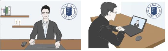 1.复试前按要求安装调试好设备。考生端两台设备开启摄像头,“一机位”电脑或手机摄像头对准考生本人(图1),“二机位”手机摄像头从考生后方成45°角拍摄(图2)。要保证考生考试屏幕能清晰地被复试专家组看到。具体效果见下图: